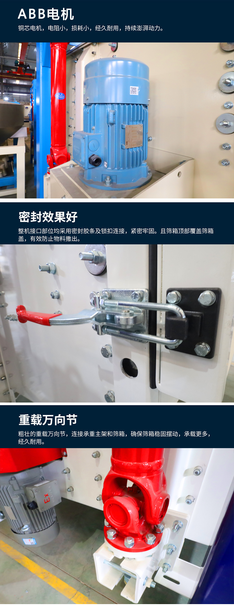 1、采用平麵回轉原理,改善了物料在篩網上的分布狀態,有效地提高了篩網使用率;
